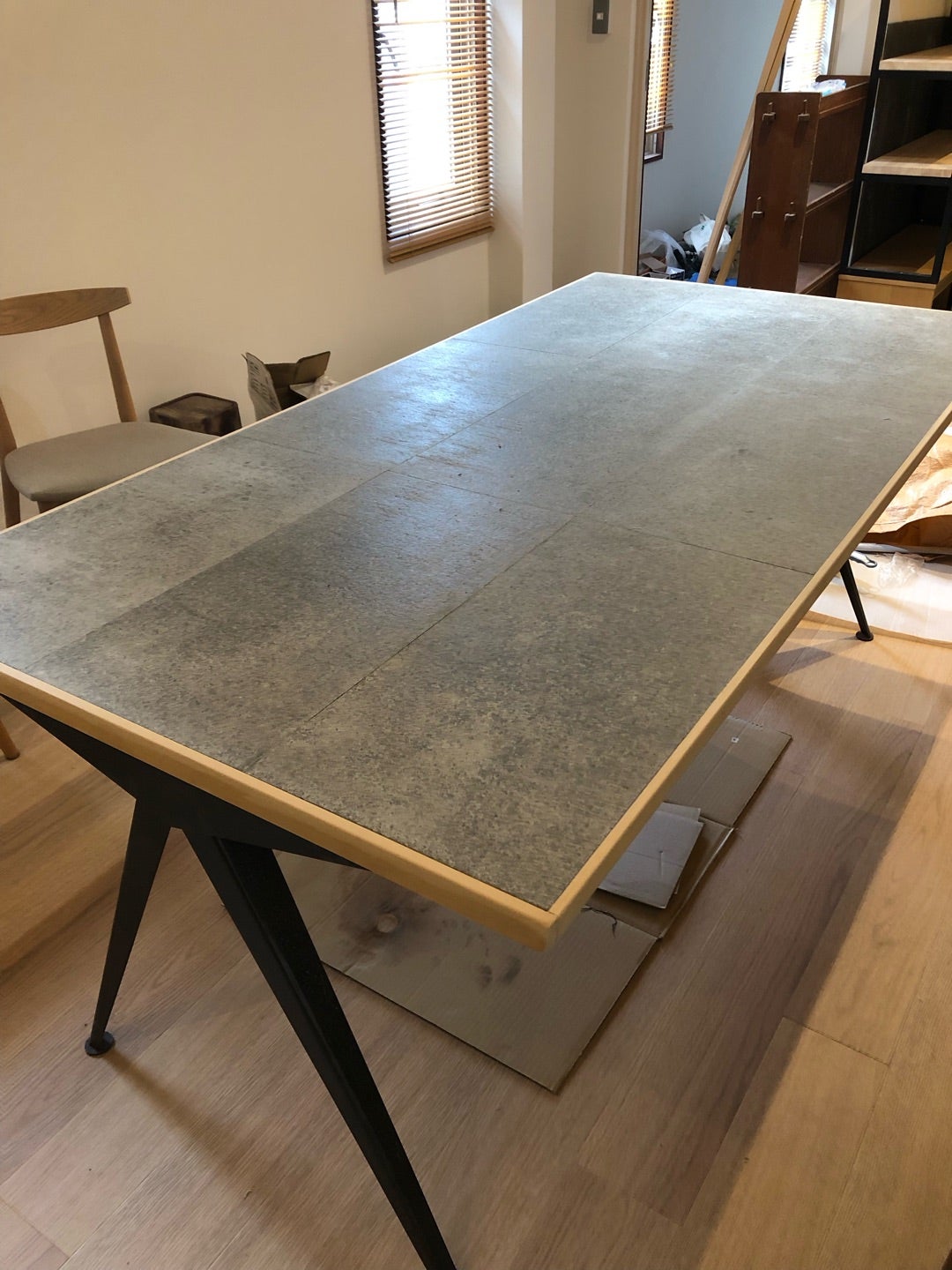 スチールの脚とケイミューのソリドで作ったダイニングテーブルです。天板だけで30キロくらいあります。よく言えば重厚感があります!