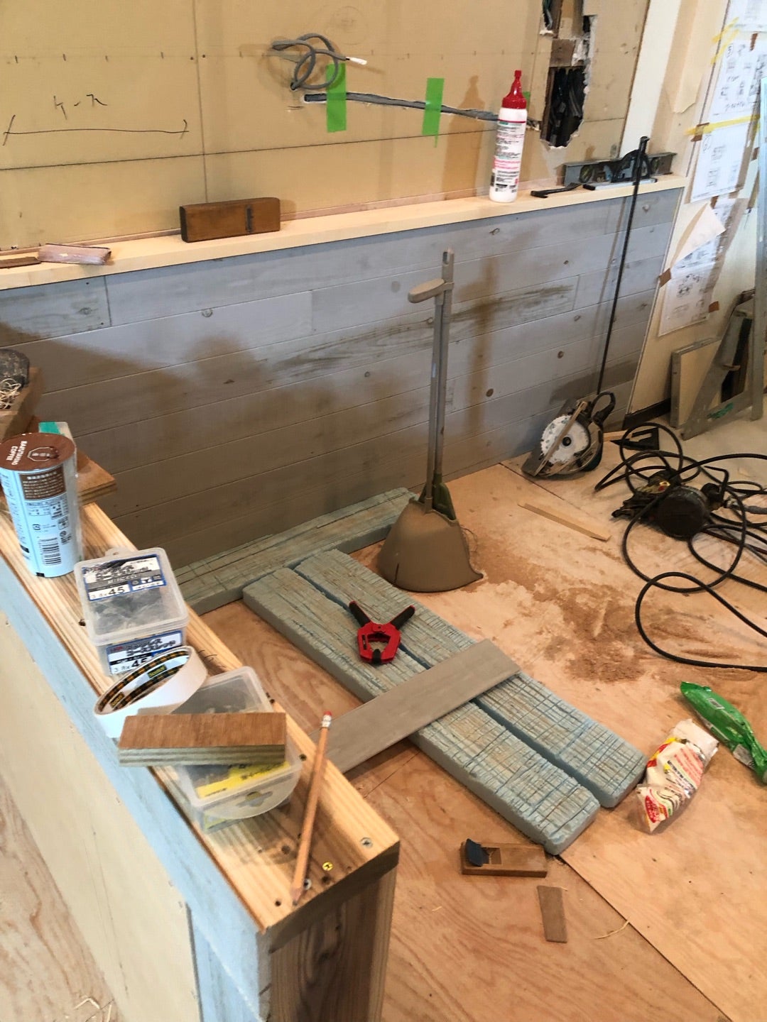 余ったフローリングを壁に使ったり、相変わらず予算を掛けずに。をモットーにすすんでおります。